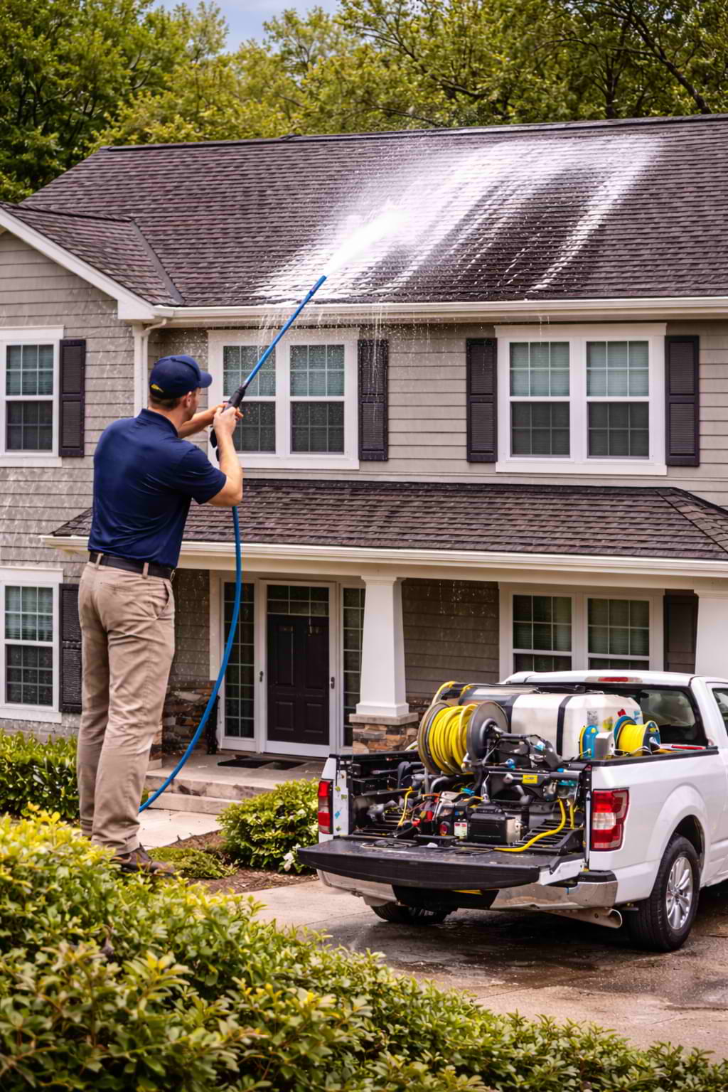 Specialized low-pressure roof cleaning systems and professional-grade solutions formulated specifically for roofing materials.