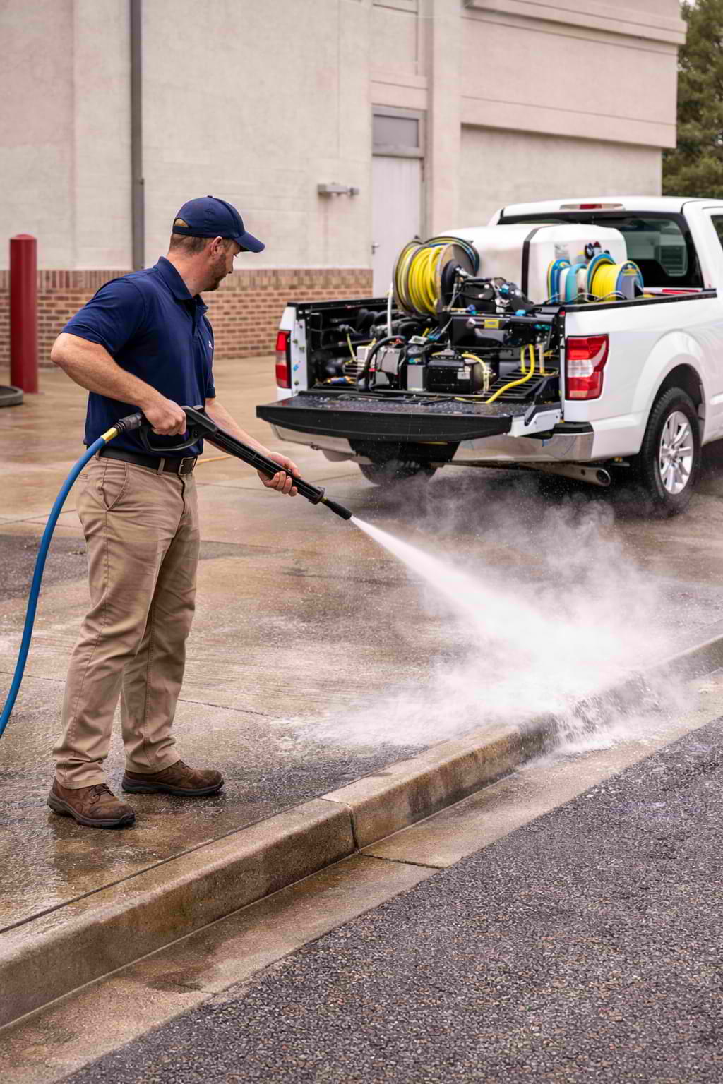 Transform stained driveways, sidewalks, patios, and concrete surfaces with professional pressure washing. Our commercial-grade equipment includes hot water capabilities (up to 200°F) essential for removing oil stains, and professional surface cleaners that deliver uniform, streak-free results.