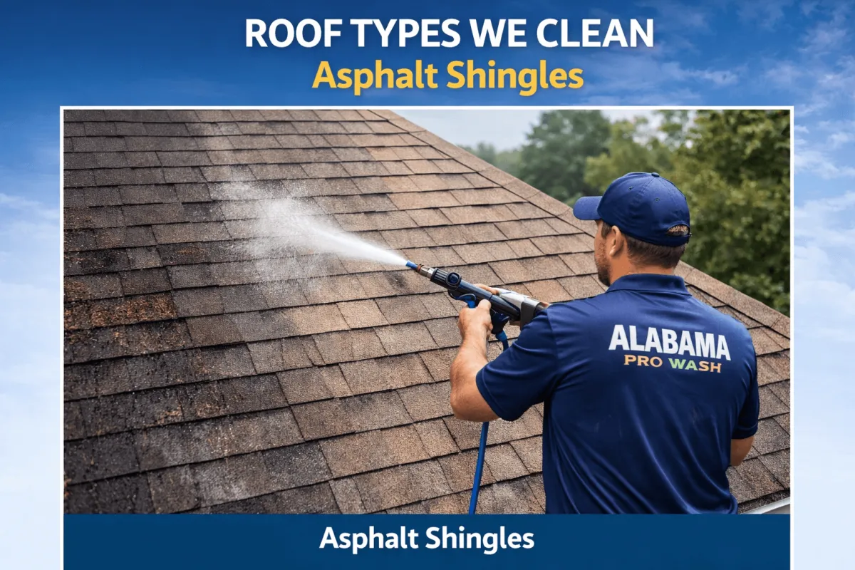 At Alabama Pro Wash, we provide professional roof cleaning in Tuscaloosa using a controlled soft wash system designed specifically for asphalt shingle roofs. Our process safely eliminates algae at the source without damaging your roofing materials.